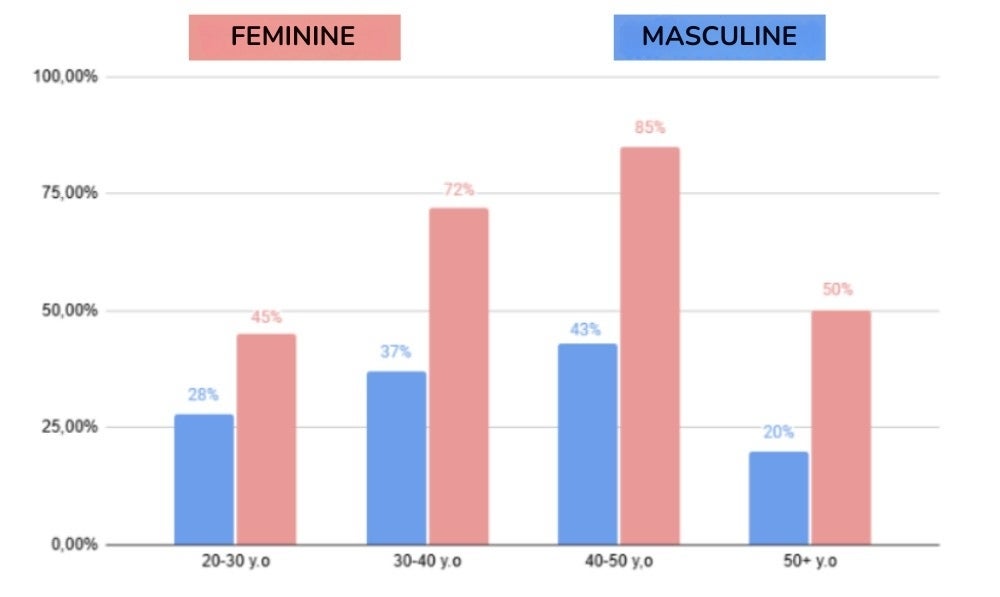 This graph shows the frequency of confirmed cases of infidelity according to age and sex in the US, the main cause being sexual dissatisfaction.